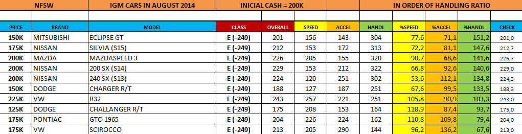 "class E" cars. other ways of sorting by overall speed by speed ratio by overall acceleration by acceleration ratio by overall handling Back to in order of appearance